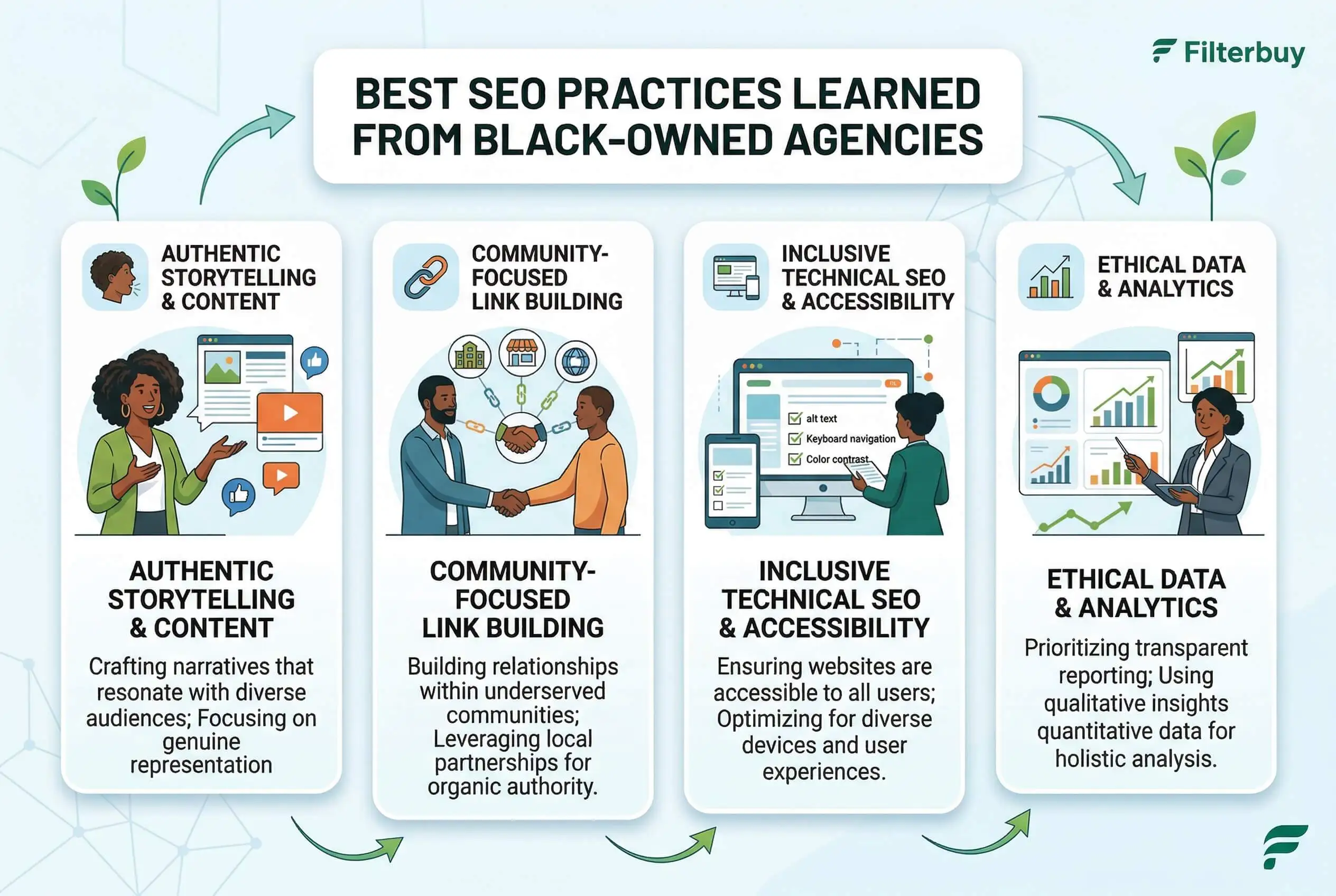 Start with audience-first keyword research that maps how your specific community actually searches. Build from there: community-based link building with trusted Black-owned publications and organizations, culturally authentic content that earns real engagement, technical SEO as a non-negotiable baseline, hyper-local optimization, and trust signal architecture built around community proof. These practices reinforce each other over time.
